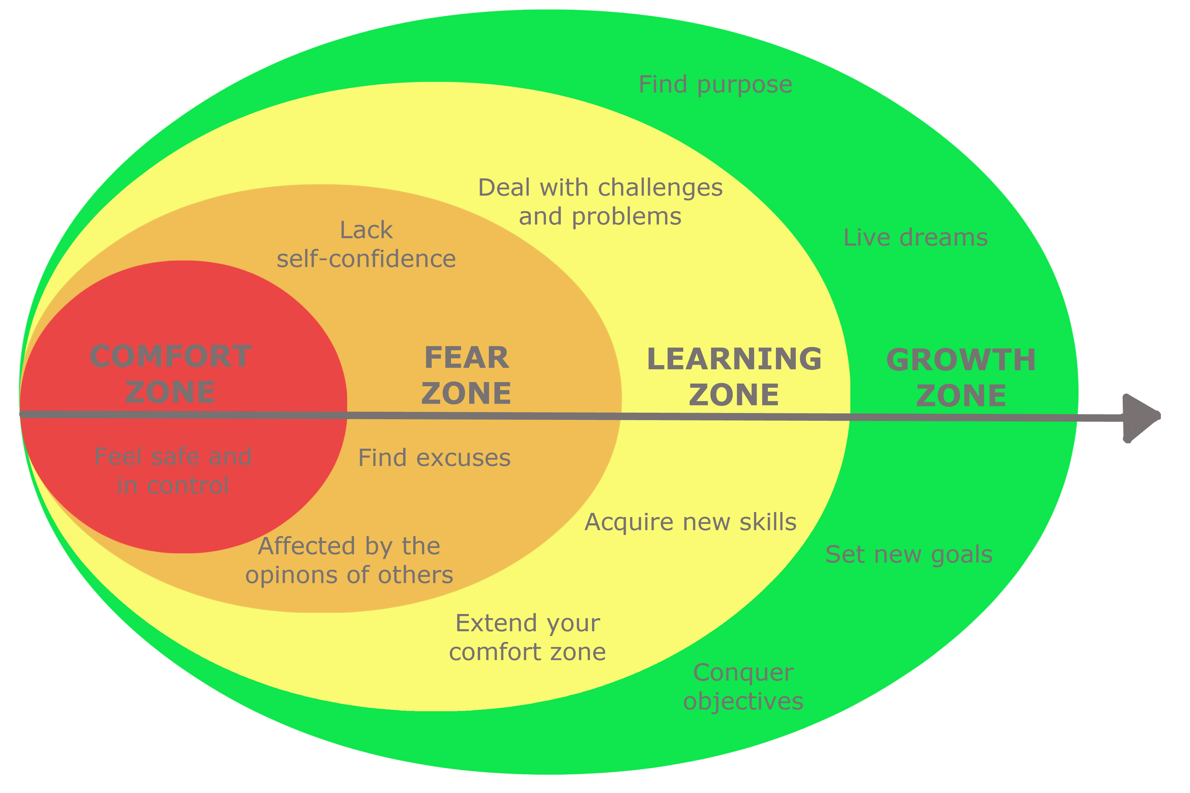 I am convinced you can entirely reinvent yourself in 12-24 months. The person you are today can be a distant memory and you can become whoever you want to be. But we have to step out of the red circle and into the fear zone before we ever begin to learn and grow. I like to think of this as reinvention with intention.